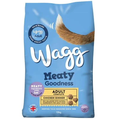Wagg Meaty Goodness Adult Complete Chicken Dinner 12kg is a complete dry dog food made in the UK, featuring high-quality meat and chicken for digestible protein, plus balanced vitamins, minerals, and omega fatty acids to support your dog’s health, strong bones, and a shiny coat. Suitable for all dog breeds and sizes.