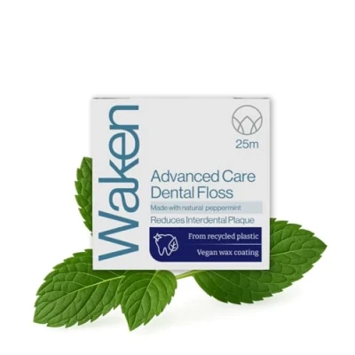 Waken , 25m peppermint dental floss, 100% natural flavor, reduces plaque and gum disease, clinically tested, vegan eco friendly, sustainable packaging, recyclable, white