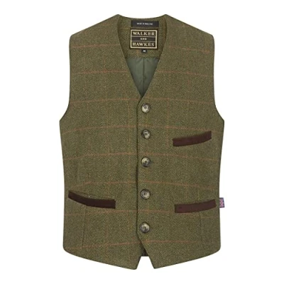 WALKER AND HAWKES Men's Derby Tweed Alcott Waistcoat Dark Sage Medium