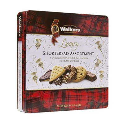 Walker's Shortbread Luxury Milk & Dark Chocolate Keepsake Tin is the ideal treat to share with your loved ones; This appealing tin can be treasured and reused time and time again, long after you have finished the flavoursome shortbreads inside. Made with the traditional Walker's family 125-year-old recipe, this keepsake tin contains delicate pure butter, milk and dark chocolate shortbreads in a variety of shapes; They go excellently with a cup of tea, coffee or simply on their own. This beautiful tin features Walker's iconic emblem of Bonnie Prince Charlie and Flora MacDonald cut out from their distinctive red tartan; It would make for the perfect gift delivered with love from Scotland, to the delight of friends and family. No added artificial colours, flavourings or preservatives; Suitable for vegetarians and certified Kosher OU-D; Made using only the best ingredients such as pure creamery butter and the finest flour. Proudly baked in the heart of Speyside, these chunky shortbreads combine rich butter, milk chocolate and dark chocolate flavours with a unique crispness of texture; Always keep stored in a dry, cool place.