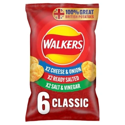 Multipack of Walkers Classic Variety crisps Multipack contains 2 x Ready Salted, 2 x Cheese & Onion and 2 x Salt & Vinegar Made with 100% Great British Potatoes Fresh taste guaranteed Perfect crisps for lunch and snacking Suitable for vegetarians No added MSG, Artificial Colours, or Preservatives Walkers Snack Foods Ltd, PO Box 23, Lelcester, LE4 8ZU, UKFresh taste guaranteed