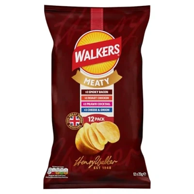 A combination of your favourite Meaty Walkers crisp flavours in 25 g bags Includes 12 individual bags including Roast Chicken (3 Packs), Smokey Bacon (3 Packs), Prawn Cocktail (3 Packs), Cheese & Onion (3 Packs) Keep it simple with Meaty Walkers flavours - just grab a pack and you are sure to find one you like; are you a Cheese and Onion or Roast Chicken; that's the real question An ideal snack for tossing into the lunchbox or pairing with your favourite sandwich Suitable for vegetarians, no artificial colours, preservatives or MSG