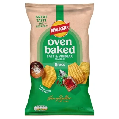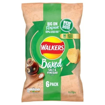 Delicious baked Walkers crisps with a classic salt and vinegar flavouring Baked for extra crispy crunchiness Walkers Oven Baked contain 50% less fat than regular potato crisps Enjoy on-the-go or packed into a lunchbox Each multipack contains 6 individual packs