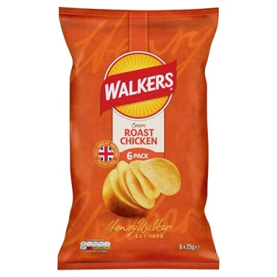 Walkers Roast Chicken Multipack Crisps 6x25g Multipack of Walkers Roast Chicken crisps Made with 100% Great British Potatoes Fresh taste guaranteed crisps for lunch and snacking Multipack contains 6 bags of crisps Suitable for vegetarians No added MSG, Artificial Colours