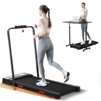 【Walking Pad Treadmill with Incline】The walking pad treadmill has a manual incline function, and you can adjust the slope according to whether you are walking or jogging to achieve your exercise effect. Help you burn more calories, improve exercise efficiency, and achieve your fitness goals faster. 【2 in 1 Design Walking Pad】The 2-in-1 walking pad treadmill has a speed rang of 1.0-8.0KM/H and can not only for running, but also for use under the desk. Meet the various exercise needs of the home and office. 【LED Display & Remote Control】Multi-functional LED display clearly shows speed, distance, time, calories and step, Help you better grasp the exercise state in real time. The remote control can easily to adjust the speed of the walking pad or stop the treadmill. 【Installation-Free & Portable Design】The foldable treadmill arrives fully assembled and can be used directly after unboxing. The front transport wheels make it easy to move anywhere, can be easily stored under desk, bed, or sofa. 【Powerful and Quiet Motor】This under desk treadmill equipped with a powerful and quiet motor, Maximum load capacity up to 110 KGS. Enjoy a quiet and comfortable exercise experience at home or in the office without worrying about disturbing others. 【Wide Non-slip belt】The walking pad treadmill offers 100cmx40cm running belt, giving you a more pleasant experience. Equipped with 5 layers of anti-slip belt, effectively decrease joint impact and protect your knees.