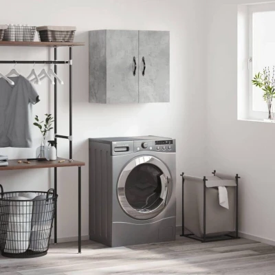 ManoManoGeneral description This wall cabinet is designed to be both a decorative and practical addition to your home decor. It features a wall-mounted design that saves floor space while providing ample storage for your daily essentials, keeping them organized and easily accessible. The top surface can also be used to display your favorite photos, decorations, or flowers. Technical specifications Colour: Concrete grey Material: Engineered wood Dimensions: 60 x 31 x 60 cm (W x D x H) Assembly required: Yes Installation Screws and plugs for wall mounting are not included; it is recommended to use screws and plugs suitable for your specific wall type. If unsure about installation, consulting a professional is advised. Please read and follow each step of the provided instructions carefully. Other information