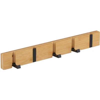 General description A tidy entrance area immediately creates a good first impression. With this wall-mounted coat rack, you can keep everything neat and organized. You can hang your bags, jackets, scarves, and more on the hooks, while the space-saving hook rail takes up very little room. If you ever don't need a hook, you can simply fold it up to prevent unnecessary protrusion. Technical specifications Dimensions (5 hooks): H x W x D: approx. 5.5 x 42 x 5 cm Weight: approx. 300 g Load capacity: approx. 5 kg Material: Bamboo, aluminium Colour: Natural, black Installation Attach the hook rail to the wall using the included mounting materials. Can be attached by drilling or using adhesive. Usage Ideal for jackets, scarves, handbags, hats, etc. Organizes your home entrance area. The hooks fold away when not in use.
