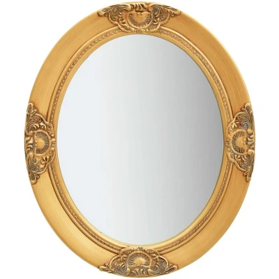 General description This beautifully designed wall mirror features an ornate frame that creates a classic atmosphere in your dressing room. The antique-look mirror has a sturdy wooden frame meticulously crafted in a decorative Baroque pattern, complemented by a unique bevelled edge. Technical specifications Colour: Gold Material: Wood, glass, and engineered wood Dimensions: 50 x 60 cm (L x W) Mirror shape: Oval With mounting hooks Other information