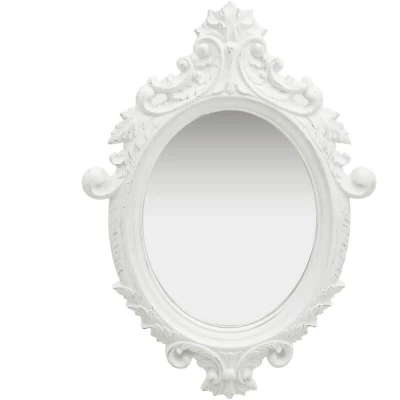 General description This beautifully designed wall mirror with an ornate frame creates a classic atmosphere in your dressing room. The antique-look mirror features a sturdy PU frame that is meticulously crafted in a decorative castle-style pattern. Additionally, the flat edge gives this mirror a unique look. The mirror is ready to be wall-mounted thanks to the already installed hook on the backboard. Technical specifications Colour: White Material: Polyurethane, glass, and engineered wood Dimensions: 56 x 76 cm (L x W) Mirror shape: Oval With mounting hook Other information