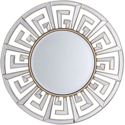 General description This decorative round mirror in gold enhances modern and glam interiors with its unique framing. The gold border features a Greek key inspired pattern, adding a distinctive finishing touch. It looks stunning in various settings, including the living room, bedroom, or hall, embodying the essence of 'classic glamour'. Technical specifications Product Type: Decorative Mirror Style: Glam General Color: Gold Main Material: MDF Additional Material: Glass Shape: Round Finish: Gloss Dimensions: Width: 70 cm, Height: 70 cm, Depth: 3 cm Weight: 6 kg Installation With hooks on the back for easy wall hanging Safe and stable mounting Does not require assembly Usage Enlarges interior visually Decorative yet functional Retro style Other information Maintenance tips for MDF: Clean with a mild cleaner and soft cloth, wipe dry afterwards; avoid abrasive cleaners; use a polish agent for copper or chromed elements. Maintenance tips for Glass: Clean with a mild cleaner or glass