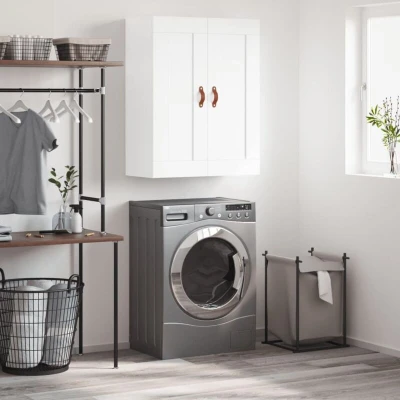 ManoManoGeneral description This wall-mounted cabinet features an elegant design, making it a timeless addition to your interior decor. It is constructed from high-quality engineered wood, providing strength, stability, and moisture resistance. The cabinet includes three compartments with two doors, offering ample storage space for organizing daily essentials. Its wall-mounted function saves floor space, and it can be easily hung on the wall. The faux leather door handles add a touch of sophistication, while the versatile design allows it to be placed on top of a sideboard to create a highboard, suitable for any living space. Technical specifications Colour: White Material: Engineered wood, faux leather Dimensions: 69.5 x 34 x 90 cm (W x D x H) Assembly required: Yes Installation Screws and plugs for mounting on the wall are not included; it is recommended to use screws and plugs suitable for your specific wall type. If unsure, consult with a professional for installation guidance. Follow