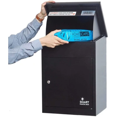 General description Secure, medium-sized parcel delivery drop box designed for small to medium-sized parcels. The Smart Parcel Box® features a secure locked door to keep parcels safe when you're not at home. It is suitable for both wall and floor mounting, allowing for versatile installation options. Technical specifications Brand: Smart Parcel Box® Dimensions: W 440 x D 350 x H 580 mm Colour: Black Material: 7mm Galvanised Steel Lockable: Key lock with 3 keys Weather-Resistant: Powder coated with floor raisers Max Parcel Size: 320 x 205 x 120 mm Warranty: Manufacturer's Warranty of up to 3 years Installation The Smart Parcel Box® is delivered with appropriate fixtures and fittings. Please ensure that these are compatible with your property before installation. Usage Designed to accept deliveries when you are not at home, parcels simply sit in the holding compartment and can be retrieved using your access key. Each parcel box has its own unique barcode, which can be used as proof of