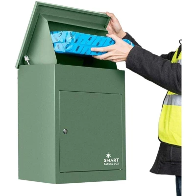 ManoManoGeneral description Secure and stylish, the Smart Parcel Box® Medium Wall Mounted Parcel Box in Green is designed for the safe delivery of small to medium-sized parcels. With a lockable door and a robust construction, it ensures that your deliveries are secure when you're not at home. This versatile box can be mounted on walls or floors, making it a practical addition to any home. Technical specifications Brand: Smart Parcel Box® Dimensions: W 440 x D 350 x H 580 mm Colour: Green Material: 7mm Galvanised Steel Lockable: Key lock with 3 keys Weather-Resistant: Powder coated with floor raisers Max Parcel Size: 320 x 205 x 120 mm Warranty: Manufacturer's Warranty of up to 3 years Installation Each Smart Parcel Box® comes with appropriate fixtures and fittings. Ensure that these are compatible with your property before installation. Usage The Smart Parcel Box® is designed to securely hold parcels when you are not at home. Deliveries can be made directly into the box, and parcels can be