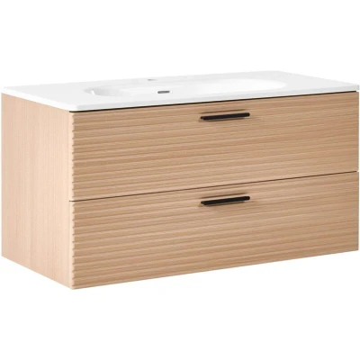 General description This elegant wall-mounted bathroom cabinet with a basin is a stylish and practical solution for modern bathrooms. Designed with ribbed fronts, black handles, and built-in tap holes and overflow protection, it combines style and functionality. With two spacious drawers for your essentials and a wide sink offering plenty of space, it's the perfect choice. Technical specifications Product Type: Bathroom Cabinet Style: Scandinavian General Color: Brown, White, Black Shade: Light Brown Main Material: MDF Additional Material: Aluminium Finish: Melamine Dimensions: Depth: 48 cm, Width: 100 cm, Height: 50 cm Basin Dimensions: 65x29 cm Weight: 32 kg Weight Capacity: 32 kg Drawer Weight Capacity: 10 kg Installation Full assembly required (60-90 min) For safety reasons, the product should be mounted to the wall Usage Clean MDF with a mild cleaner and a soft cloth, wipe dry after cleaning Clean resin with a mild cleaner and a soft cloth, wipe dry afterwards
