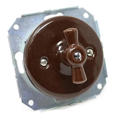 ➡️ Porcelain Brown Switch ➡️ For wall mounting, 250V 10A ➡️ Made of brown porcelain without frame, vintage style. For installation it is necessary to incorporate a frame (not included). ➡️ As a switch switch allows you to turn the light on and off from two different points. ➡️ DIMENSIONS - Length dimension 70mm, width dimension 70mm, height dimension 62mm., Manufacturer: Prendeluz