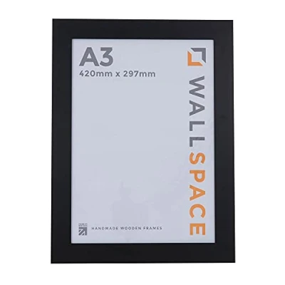 QUALITY WOODEN A3 PICTURE FRAMES: This A3 Frame is perfect for displaying your treasured photos, prints, poster or other art work. Easy to fit into, and simple to hang on a wall. A3 Frame made from REAL WOOD and with REAL GLASS LONG LASTING MATERIALS: These A3 Black Frames are made by skilled picture framers using solid wood and REAL GLASS for optimal viewing of your pictures. This A3 Frame size has a classic contemporary look which will look great in any home or office. IDEAL FOR ANY OCCASION: Our A3 Black Frame is a great way to store and display your memories, achievements or favourite artwork. You can add an eye-catching display in your home or office, where this A3 Photo Frame will enhance your chosen decor whether for in your own home or as a gift for a chosen loved one. LANDSCAPE or PORTRAIT DISPLAY: This Black A3 Frame can hang either vertically (portrait) or horizontally (landscape) thanks to it's built in hangers already attached to the back. Black Photo Frame A3 (or 420 mm x 297 mm in metric) MADE IN THE UK: These Black A3 Frames are made in the UK by one of our skilled picture framers. As members of the Fine Art Trade Guild we hold ourselves to high standards and each and every picture frame A3 is meticulously checked and inspected after being made. We are a leading UK Manufactuer of Real Wooden Picture Frames - CHECK OUT OUR FANTASTIC AMAZON REVIEWS! Buy A3 Picture Frames from the UK's most trusted picture frame manufacturer!