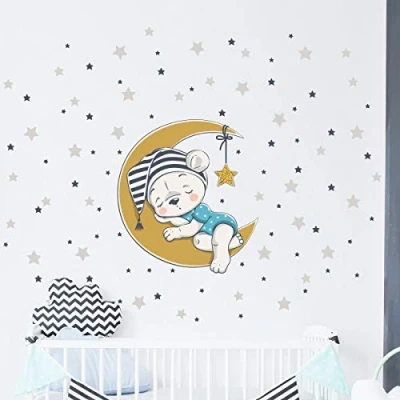 Wall Stickers for Children Baby Room Decoration Bear on Moon + 100 Stars Sticker H30 x L30 cm