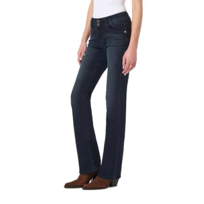 Mid-rise contour waistband prevents gapping so you can sit with us with this shape-sculpting fit. This jean hugs your curves Made with instastretch denim, our premium stretch denim offers outstanding recovery that hugs and sculpts all day Regular=32", Long=34", Short=30" inseam. 17.5" Leg opening - 9" Front rise. Measurements taken on size 5. Model is 5' 9" and wearing a size 5 5 pocket design featuring contrast-stitched button-flap back pockets Tight fit through the knee, faded legs, whiskered hips