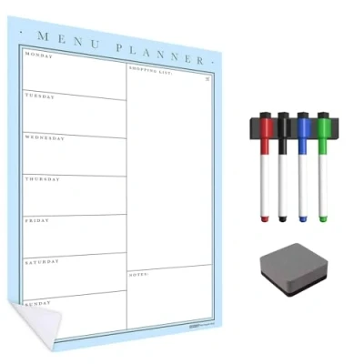 WALL-TAC: We print our designs onto state of the art Wall-Tac material, which utilises a re-adhesive and re-positionable sticky backing. You can place your new planner almost anywhere, and then when you want to, you can move it to an entirely new place. EXTRA THICK: Our Wall-Tac adhesive is double the thickness of other adhesive planners, which makes the dry erase surface more plush and comfortable to write on. the added thickness is also less susceptible to showing minor imperfections of the wall or surface, through the material. We use premium technology to provide you with the best product for your home, school or office. WHAT YOU GET: Larger than A3 size (430mm X 300mm) weekly wall planner which has plenty of space for each day of the week, a shopping list and either a notes section or memos for the following week. Each Wall-Tac Planner is digitally printed on premium paper and finished with a specialist gloss ensuring a long lasting dry wipe surface. You will also receive a set of 4 magnetic dry erase pens, magnetic dry wipe eraser and our Re-adhesive Ferro Mounting Strip. STAY ORGANISED: Reduce stress by keeping ahead of your tasks and planning your week in advance. Take notes of your meals, plan your diet and nutrition and make sure you know what groceries to buy. With the shopping list, you can spend less time shopping online or in store; it’s a great way to stop over spending! CLASSIC AESTHETIC: The elegant design will not only allow your thoughts to be eye catching, but you can also choose a colour to suit your personal decor. With a full magnetic sheet covering the back, you will be able to attach your new planner to various metal surfaces. Use the coloured pens to further highlight important notes or memos.