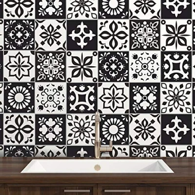 WALPLUS 15cm(6") 24 pcs Arjorelle Black and White Wall Tile Stickers Peel Stick Backsplash Self Adhesive Decals Home Decor DIY Splashbacks Spring Easter Decoration Paint on Tiles Ideas