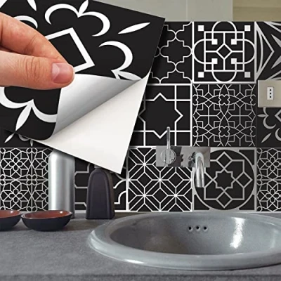 WALPLUS 15cm(6")@48pcs Arabic Black and Silver Wall Tile Sticker Paint Stick on Tiles Peel Self Adhesive Stickers for Kitchen Bathroom Transfer Backsplash