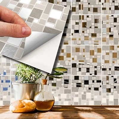 WALPLUS 15cm(6")@72pcs Metallic Silver Beige Stone Mosaic Wall Tile Sticker Paint Stick on Tiles Peel and Self Adhesive Stickers for Kitchen Bathroom Transfer Backsplash