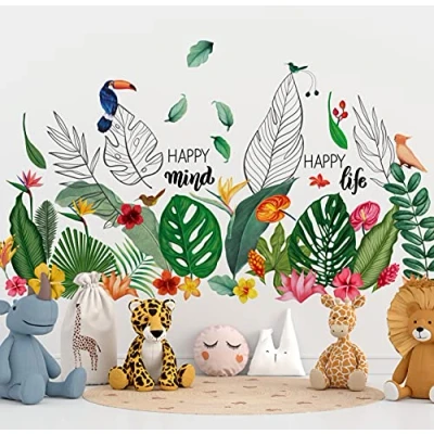 WALPLUS 52 Pieces Tropical Leaves and Flowers Wall Stickers Mural Art Vinyl Nursery Decorations for Living Room Kids Bedroom Decors Home Removable DIY Decals Hotels Cafe Office