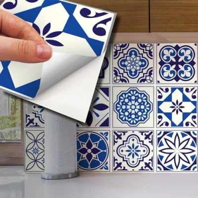 WALPLUS 72 Pcs 15cm(6") Tile Stickers Peel and Stick Backsplash Self Adhesive Removeable on Wall Vinyl Home Decoration DIY for Living Kitchen Bedroom Splashbacks Spanish & Moroccan Blue