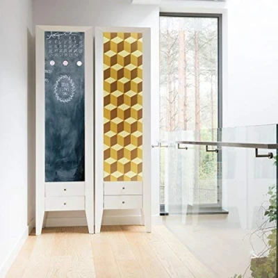 The package contains 2 sheets of 54cm x 54cm Yellow 3D cubes, and 1 sheet of 45cm x 200cm blackboard sticker This is a combination of 3 products it is not a whole product in one label. With this product you can achieve a finishing size of 80 cm x 120 cm , more or less depending on your preferences. Clean very well the surface you intend to apply the sticker on. This product is easy to apply and will not leave stains on walls when removed. Apply on painted surfaces at least 3 weeks after painting. If applied on wallpaper the sticker will NOT be REMOVABLE. Can be applied on laminated surfaces, but might cause damage when removed.