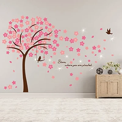 Walplus Swarovski Crystals and Pink Blossom Flowers Wall Stickers, Vinyl, Multi Colour, 90 x 30 0.5 cm