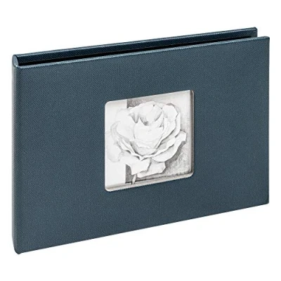 High quality mini album with hard cover paper cover With square image cut-out 6 x 6 cm on the front for a personal photo With black pages for 12 photos in landscape format 10 x 15 cm Choice of colours: black, blue and grey
