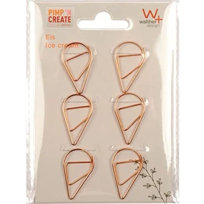 Decorative paper clips made of metal in the shape of an ice cream cone The modern copper clips are practical and decorative Versatile uses, e.g. as a bookmark in the photo album, notebook, calendar or address book. Or for attaching photos, pictures, cards, notes, invitations, reminders, etc. The staples are also a decorative accessory when scrapbooking Box contents: 6 clips in a polybag