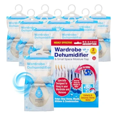 Powerful Moisture Absorption – Each hanging dehumidifier bag absorbs up to 500ml of excess moisture, protecting against damp, mould, mildew and condensation. Keeps wardrobes and storage spaces dry and your belongings safe. Long-Lasting Freshness – Designed to work continuously for 4–8 weeks per bag (depending on humidity levels). Provides reliable, hassle-free protection and keeps clothes, fabrics and rooms feeling fresh and odour-free. Strong & Leak-Proof Design – Features a reinforced hanging hook and durable pouch that won’t break or spill, even when full. Our improved hanger design ensures the bag stays securely in place – no mess, no worries. Easy to Use & Mess-Free – Simply unwrap and hang – the high-grade calcium chloride crystals get to work immediately. The transparent bag shows water levels at a glance, and once full, just dispose and replace with a new one. Versatile Home Protection – Ideal for use in wardrobes, closets, caravans, garages, basements, bathrooms, kitchens, and other storage areas. Prevents damp build-up and helps protect clothes, books, furniture and valuables from humidity damage.