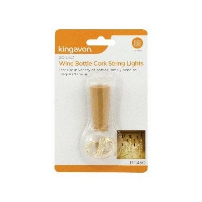 SPECIFICATION This cork is manufactured with a 2m flexible string wire with 20 warm white LED lights & slide on/off switch. It requires 3 x LR44 button cell batteries which are supplied. It is suitable for use in a variety of bottles as you simply bend to your required shape making it an ideal decoration for parties, BBQ’s, weddings & more. CE Approved BARCODE 5017403 123293 CARTON QTY 24/0 Pcs APPROX ITEM WEIGHT 20g PACKAGING Blister Card