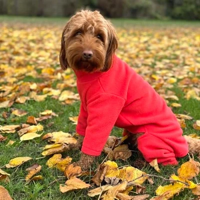 Please note: 1. THE SIZES DO RUN SLIGHTLY SMALL - IF UNSURE WE RECOMMEND TO SIZE UP. Dog in main listing image for black, teal and coral: Small female cockapoo, 9kg | Fleece size: Medium 2. Colours may appear slightly different depending on lighting or screen settings . Weather resistant: Here to keep your pooch warm, and dry whilst on your adventures together. Our fleece will provide some protection from the rain and mud, and minimises the clean-up time after your walk! Super soft & stretchy: The fleece is super soft, and naturally has more stretch and give in the material helping with getting the fleece on and off, and allowing your dog to run around with unrestrained movement. Comfortable: The fleece does not have any straps, zips, or Velcro, ensuring their fur is not caught on anything, and that the fleece works well as a one piece. Six Sizes: We have a range of sizes available (XS-XXL) to ensure that you can find a fit that is just right. The jumper does come up a little bit small, so we would advise to size up if your dog is in between sizes. Please refer to the size chart for measurements. Seven Colours: The fleece is offered in seven colours, a classic black, gorgeous teal, vibrant coral, garden green, pastel lilac, burnt orange and a fresh mint. Whichever one you choose, your pooch will be the envy of all of the other dogs in the park! Care guidance: Once the jumper needs a little bit of a freshen up, you can pop it in the washing machine on a cool wash, and hang to dry.