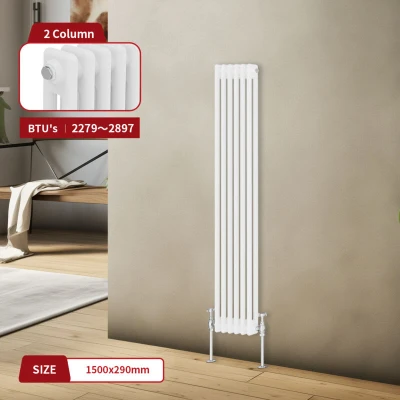 General description Experience the perfect blend of tradition and style with our Victorian-style column radiators, offered in double, triple, and quad column layouts. These radiators are ideal for those looking to make a contemporary statement while honoring classic design elements. With their timeless appeal, designer column radiators will always remain in vogue. Not only do these radiators enhance your interior aesthetics, but they also provide high heat outputs, ensuring that your spaces remain warm and inviting without sacrificing style. Crafted from high-quality steel, all of our radiators come with a 10-year Fit and Forget Guarantee. Technical specifications Material: 1.5mm low carbon steel construction Size: 1500 x 290mm Panel: Double Column Finish: White Number of bars: 6 High Heat Output: 2280-2897 BTU (in T50 - T60) Model: Vertical Double Panel in White Finish Accreditation: Tested to BS EN442 Triple layered finish to exceed 200 hours of neutral acid salt spray testing
