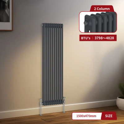 General description Experience the perfect blend of tradition and style with our Victorian-style column radiators, offered in double, triple, and quad column layouts. These radiators are ideal for those looking to make a contemporary statement while honoring classic design elements. With their timeless appeal, designer column radiators will always remain in vogue. Not only do these radiators enhance your interior aesthetics, but they also provide high heat outputs, ensuring that your spaces remain warm and inviting without sacrificing style. Crafted from high-quality steel, all of our radiators come with a 10-year Fit and Forget Guarantee. Technical specifications Material: 1.5mm low carbon steel construction Size: 1500 x 470mm Panel: Double Column Finish: Anthracite Number of bars: 10 High Heat Output: 3798-4829 BTU (in T50 - T60) Model: Vertical Double Panel in Anthracite Finish Accreditation: Tested to BS EN442 Triple layered finish to exceed 200 hours of neutral acid salt spray