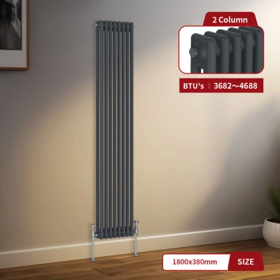 General description Experience the perfect blend of tradition and style with our Victorian-style column radiators, offered in double, triple, and quad column layouts. These radiators are ideal for those looking to make a contemporary statement while honoring classic design elements. With their timeless appeal, designer column radiators will always remain in vogue. Not only do these radiators enhance your interior aesthetics, but they also provide high heat outputs, ensuring that your spaces remain warm and inviting without sacrificing style. Crafted from high-quality steel, all of our radiators come with a 10-year Fit and Forget Guarantee. Technical specifications Material: 1.5mm low carbon steel construction Size: 1800 x 380mm Panel: Double Column Finish: Anthracite Number of bars: 8 High Heat Output: 3682-4689 BTU (in T50 - T60) Model: Vertical Double Panel in Anthracite Finish Accreditation: Tested to BS EN442 Triple layered finish to exceed 200 hours of neutral acid salt spray