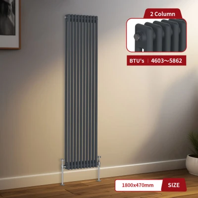 General description Experience the perfect blend of tradition and style with our Victorian-style column radiators, offered in double, triple, and quad column layouts. These radiators are ideal for those looking to make a contemporary statement while honoring classic design elements. With their timeless appeal, designer column radiators will always remain in vogue. Not only do these radiators enhance your interior aesthetics, but they also provide high heat outputs, ensuring that your spaces remain warm and inviting without sacrificing style. Technical specifications Material: 1.5mm low carbon steel construction Size: 1800 x 470mm Panel: Double Column Finish: Anthracite Number of bars: 10 High Heat Output: 4603-5863 BTU (in T50 - T60) Model: Vertical Double Panel in Anthracite Finish Tested to BS EN442 Triple layered finish to exceed 200 hours of neutral acid salt spray testing Compatibility and accessories Suitable for all UK central heating systems Comes with brackets and fittings