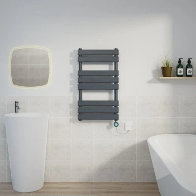 General description This Flat Electric Towel Rail in Sand Grey features a flat panel design and is perfect for keeping your towels warm and dry. With a dimension of 800x450mm and a powerful 400W thermostatic heating element, this towel rail is both functional and stylish. It is wall-mounted and comes with a 10-year 'Fit and Forget' guarantee for water leaks and a 2-year guarantee on the heating element. Technical specifications Dimension: 800x450mm Colour: Sand Grey Element Power: 400W Power Supply: 230-240V Cable Length: 1.1m Bars: 8 (2+3+3) Pressure tested to 10 bar CE marked Tested and certified to BS EN 442 standards Installation This item comes pre-filled and ready to install. T Piece Connector included for converting your towel rail or radiator to dual fuel. Industry Standard 15mm connection, all elements come with a 1.1m cable. Usage Display for clear and ease of Temperature & Time setting. 4 Timer settings: a. Free Mode: Temperature can be set independently, ranging from 30°C