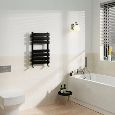 General description The satin black flat panel heated towel rail is a contemporary masterpiece, perfectly suited for modern bathroom suites. This towel rail is ideal for busy family bathrooms, combining simplicity with functionality. The entire Juva range is available in various sizes and colors to complement a wide array of styles. Technical specifications Size: 650x400mm Number of bars: 7 (3+4) Pipe Centres: 350mm Tube Type: Flat Panel Heat output: 930 BTU Finish: Black Material: Mild Steel Compatibility and accessories Can be used on all UK heating systems (tank fed or combi systems) Brackets and fixings included (valves are excluded) Installation Tested under high hydraulic pressure to ensure impermeability Usage Perfect for drying towels and adding warmth to your bathroom Other information Complete with a 10-year Fit and Forget guarantee (applies only to water leaks) All bathroom ladder radiators come with a manufacturer-leading 10-year guarantee Tested to BS EN442 Specification