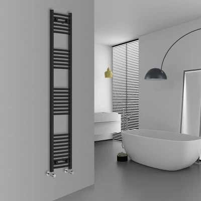 General description The WarmeHaus Curved Black Bathroom Ladder Radiator is an elegant addition to any bathroom, serving as both a functional heating solution and a stylish statement piece. Its striking black finish enhances the aesthetic of your space while efficiently warming your towels for a cozy experience after your shower. Available in various sizes, this radiator is backed by a 10-year Fit and Forget guarantee for added peace of mind. Technical specifications Height: 1800mm Width: 300mm Number of bars: 30 Wall to Centre Tapping: 73-93mm Tube Type: Curved Tube Diameter: 22mm Heat output: 1604 BTU Finish: Black Material: Mild Steel Compatibility and accessories Compatible with all UK heating systems (tank fed or combi systems) Brackets and fixings included (valves are excluded) Other information Tested under high hydraulic pressure to ensure impermeability Tested to BS EN442 Specification Manufacturer-leading 10-year guarantee