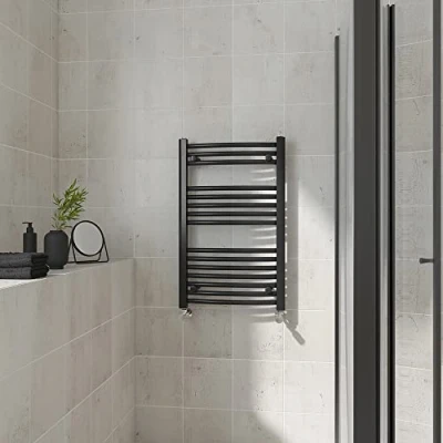 AmazonOur 800x500mm curved heated towel rail black is the perfect solution for your busy family bathroom. Features: 15 Curved bars - 74-94mm Wall to Centre Tapping - 1123 BTU heat output - 22mm cross tube diameter. Can be use on all UK heating systems. Comes with adjustable wall brackets and fittings. 10 years 'Fit and Forget' guarantee.