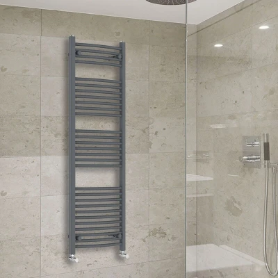 General description The 1500x500mm Anthracite Curved Heated Towel Rail is a contemporary masterpiece, ideal for modern bathrooms. This designer towel rail not only enhances the aesthetic of your space but also provides high heat output, ensuring your room stays warm and your towels remain toasty. Technical specifications Dimensions: 1500x500mm Heat output: 2149 BTU Number of bars: 29 (4+7+7+11) Durable high-quality anthracite finish Pressure tested to 10 bar, maximum working pressure 7 bar Manufactured to BS EN 442 Installation It is recommended to have a qualified plumber install this item. Other information