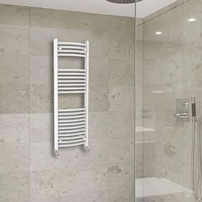 AmazonStylish curved rail ladder style towel radiator; Durable high quality white finish. Number of bars: 22(4+7+11); Heat output: 1657 BTU; Tube Diameter: 22mm. Anti leak pressure tested to 10 bars, exceed 200 hours of neutral acid salt spray testing. Manufactured to BS EN 442 and 10 year 'fit and forget' guarantee Included. Package includes 1x1200x500mm Curved Bathroom Heated Towel Rail Radiator and Fixing Pack and Brackets.