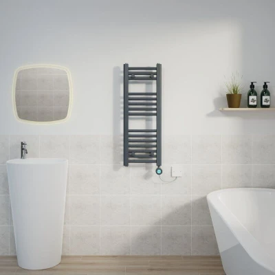 General description This Curved Towel Rail in Anthracite is designed for both functionality and style, featuring a sleek design with curved bars. With a power output of 400W, it efficiently heats your towels while adding a modern touch to your bathroom. Technical specifications Dimensions: 800x300mm Power: 400W Power Supply: 230-240V Wall Projection: 90-110mm Cable Length: 1.1m Number of Bars: 15 (3+5+7) Pressure Tested: 10 bar CE Marked Tested and Certified to BS EN 442 Standards Installation Pre-filled and ready to install Wall mounted fitting type T Piece Connector included for dual fuel conversion Industry Standard 15mm connection Usage Four Timer Settings: a. Free Mode: Temperature adjustable from 30°C to 70°C b. Constant Temperature Mode: Fixed at 50°C c. Timing Mode: Fixed at 65°C, adjustable drying time from 30 minutes to 8 hours d. Schedule Mode: Timing function available Child Lock function to prevent accidental operation Thermostatic control for safe temperature regulation