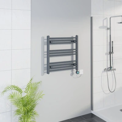 Warmehaus Smart WiFi Thermostatic Electric Bathroom Straight Heated Towel Rail Warmer Radiator with Timer 600x600mm Anthracite