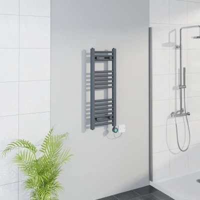 General description This WiFi Thermostatic Straight Towel Rail Timer in Sand Grey measures 800x300mm and features a durable high-quality anthracite finish. It includes a 400W WiFi electric heating element that comes pre-filled and ready to install. The towel rail has 15 straight bars (3+5+7) and is backed by a 10-year guarantee for water leaks and a 2-year warranty for the electric heating element. Technical specifications Dimensions: 800x300mm Power: 400W Number of bars: 15 Pressure tested to: 10 bar Maximum working pressure: 7 bar Manufactured to: BS EN 442 Installation Fixing pack included with plugs and vents Installation by a qualified electrician is recommended Usage WiFi Connection: Download and install the Smart Life app from the App Store or Google Play Store Temperature settings: Free Mode (30°C to 70°C), Constant Temperature Mode (fixed at 50°C), Timing Mode (fixed at 65°C, adjustable drying time from 30 minutes to 8 hours), Schedule Mode (timing function) Child Lock