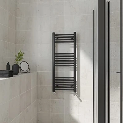 AmazonOur 1000x400mm straight heated towel rail black is the perfect solution for your busy family bathroom. Features: 16 Straight bars - 75-95mm Wall to Centre Tapping - 1062 BTU heat output - 22mm cross tube diameter. Can be use on all UK heating systems. Comes with adjustable wall brackets and fittings. 10 years 'Fit and Forget' guarantee.