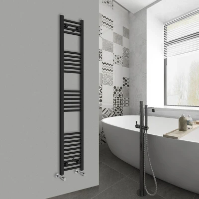 General description The WarmeHaus Straight Black Bathroom Ladder Radiator is an elegant addition to any bathroom, serving as both a functional heating solution and a stylish statement piece. Its striking black finish enhances the luxury of your space while efficiently warming your towels for a cozy experience after your shower. Technical specifications Height: 1600mm Width: 300mm Number of bars: 26 Wall to Centre Tapping: 75-95mm Tube Type: Straight Tube Diameter: 22mm Heat output: 1396 BTU Finish: Black Material: Mild Steel Compatibility and accessories Compatible with all UK heating systems (tank fed or combi systems) Brackets and fixings included (valves are excluded) Other information Tested under high hydraulic pressure to ensure impermeability Tested to BS EN442 Specification 10 year guarantee (applies only to water leaks)
